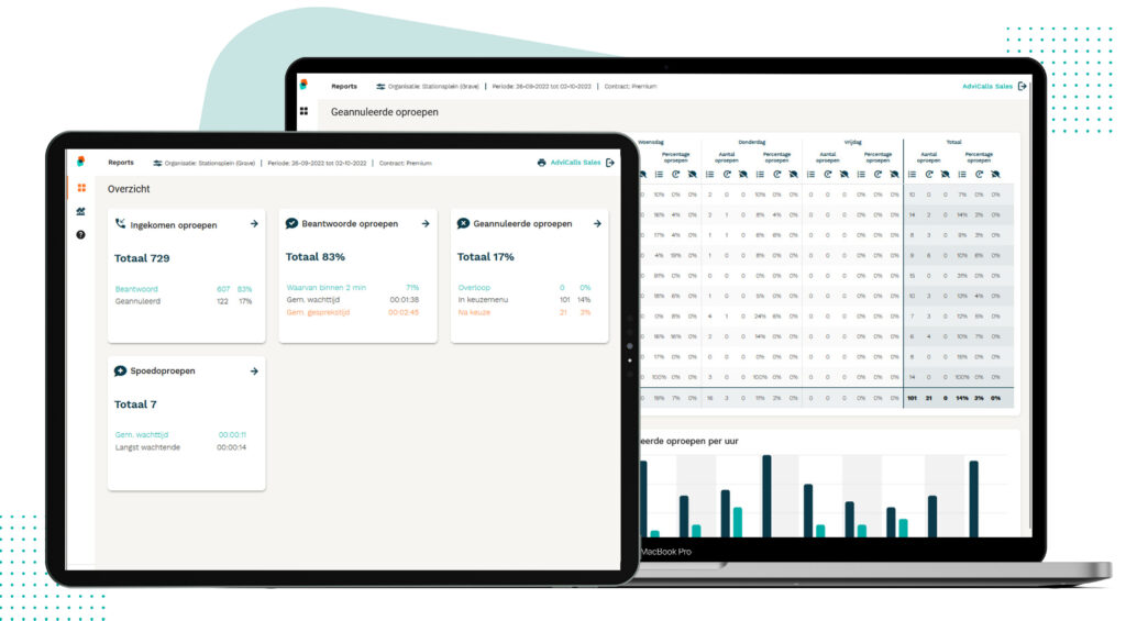 Als u hier inzicht in heeft stelt u dat in staat om actief bij te sturen, werkprocessen te optimaliseren en uw beschikbare capaciteit maximaal te benutten. De slimme rapportages van AdviCalls Reports bieden u dit inzicht.